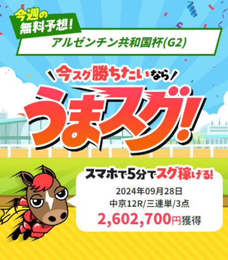 わたしはうまスグさんの、情報で人生に光りが見えました。 競馬を初めて、20年。 自分で予想した収支は、マイナスでしたが、 ここに登録して、提示された買い目を買うだけで、 月に100万は最低稼げました! 本当に簡単に高額的中を手に入れられるので、競馬初心者の人が使ったら即プラス収支確定ですね。